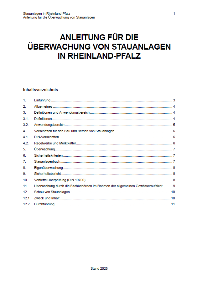 Stauanlagen in Rheinland-Pfalz: Nach dem rheinland-pfälzischen Landeswassergesetz - LWG - vom 14. Juli 2015 sind Stauanlagen mindestens nach den allgemein anerkannten Regeln der Technik zu errichten, zu unterhalten und zu betreiben (§ 73 LWG). Die behördliche Überwachung von Stauanlagen erfolgt im Rahmen der Gewässeraufsicht nach § 98 Absatz 1 Satz 2 LWG und im Rahmen der Gewässerschau nach § 101 LWG. Eine Anleitung soll die Überwachung von Stauanlagen sowie die Bewertung der Sicherheit landesweit nach einheitlichen Kriterien ermöglichen.
